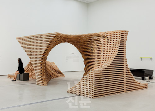 파트 투 홀 미술관에 전시할 작품은 형태보다 공간이 중요했다. 중성적인 직육면체에서 시작된 하나의 덩어리에서 가장 큰 부피를 비워낸, 그러면서도 구조적으로는 자립해 서 있는 실험적인 구조물을 만들기로 했다. 최근 디지털 기술을 이용해 복잡한 계산을 쉽게 하듯 건축에서도 프로그램을 통해 치수와 물량을 조절할 수 있다. 알고리즘을 잘 이용하면 개수의 많고 적음은 전혀 문제되지 않는다. 전체 9,076개의 각재를 73가지 길이 유형으로 분류 및 가공하고, X-Y 방향으로 서로 교차해 63개 층으로 엮었다.