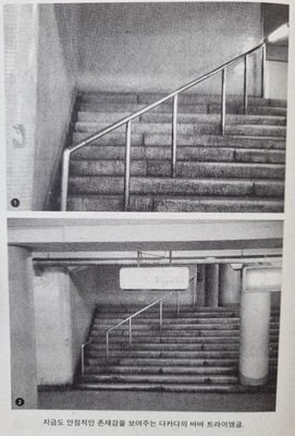 계단이 있고, 난간이 있는데, 난간 안쪽의 공간은 쓸 일이 없다. 그런데 왜 이렇게 만들었을까? 지은이와 발견자는 계단 위의 벽이 원래는 없었는데, 다른 공사로 인해 벽이 생겨서 이런 결과가 발생했다고 말한다.
